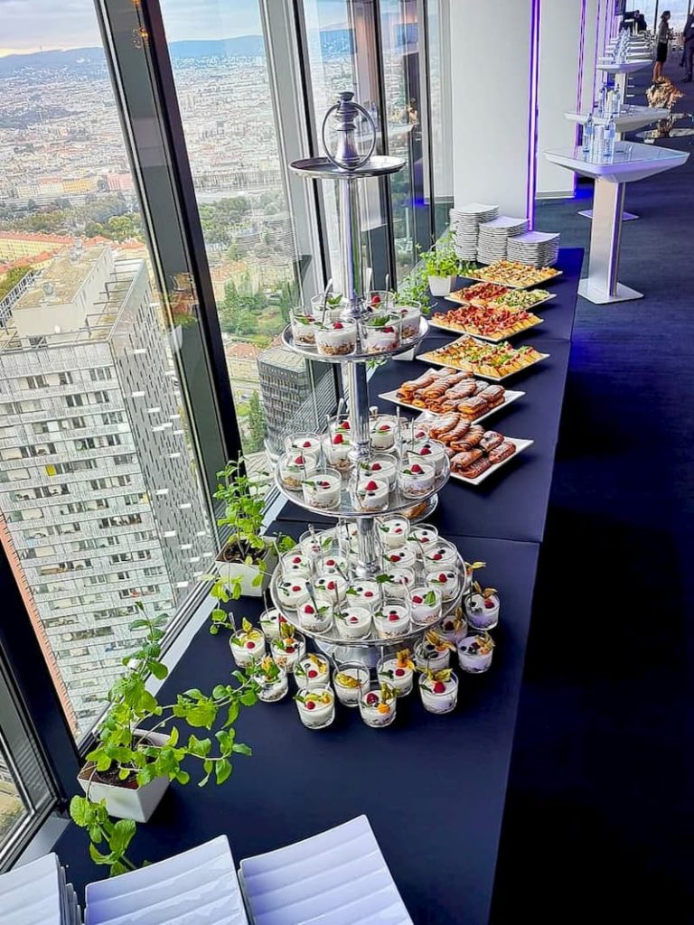 Hausgemachtes RosmarinbrotHausgemachtes ButterbriocheHausgebeizter Gravad LachsHaferflocken Windbeutel mit Wacholder-Frischkäsefüllung und geräuchertes RindsgeselchtesSüdtiroler Speck mit frisch geriebenem KrenGefüllte Butterkartoffel mit Lauch– Pilz FarceHonigmelone mit Zitronensauce und SerranoschinkenSpinatspätzle mit Steinpilzsauce und CocktailtomatenWelsfilet im Kerbelmantel mit PeperonisauceMit Mozzarella und Melanzani gefüllte HühnerbrustBitterschokoladeterrinePanna Cotta mit Burbon Vanille ApfelmousseHausgemachter Traubenstrudel